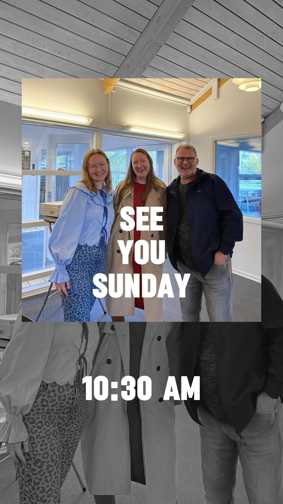 Vi mødes hver søndag kl. 10.30, hvor du er velkommen til at komme og deltage i gudstjenesten. Vi elsker at have gæster. Vi har lovsang, dagligdags relevant budskab og fællesskab. Der er også aktiviteter for børn.